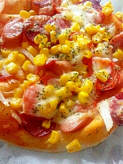 ダイニングm オリジナルトマトピザソースでベーコンとウィンナーとサラミピザ 自宅で焼き上げて
